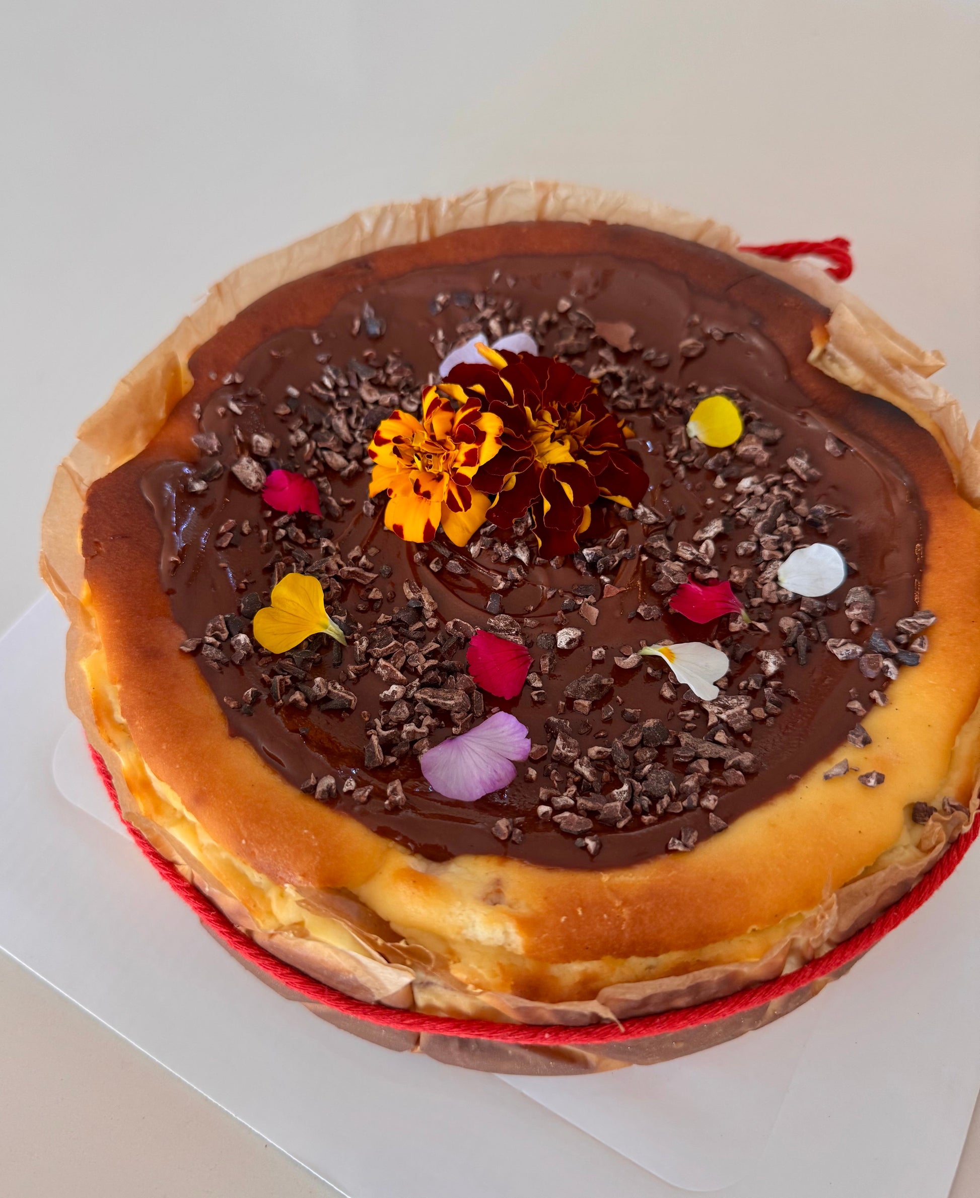 Ingredientes: queso crema, crema para batir, huevos, azúcar, vainilla, Nutella, nibs de cacao, harina de trigo.